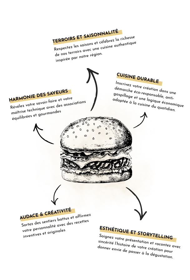 > Imaginez une recette créative et originale, reflet de votre philosophie de cuisine. Mettez en avant votre engagement, votre sens du goût et, si possible, votre collaboration avec d’autres acteurs des filières alimentaires : artisan.e, commerçant.e (cuisinier.e/restaurateur.trice, boucher.ère, boulanger.ère, pâtissier.ère, poissonnier.ère, charcutier.ère, fromager.ère…) ou professionnel.le du monde agricole (maraîcher.ère, éleveur.euse, agriculteur.trice…).